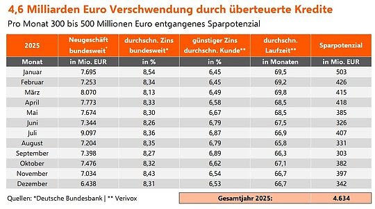 Pro Monat hätten Darlehensnehmer zwischen 303 und 503 Millionen Euro Zinsen gespart, wenn alle ihren Kredit so günstig wie möglich abgeschlossen hätten. Im gesamten Jahr 2025 haben die Deutschen so gut 4,6 Milliarden Euro durch überteuerte Kredite mit zu hohen Zinsen verschwendet.