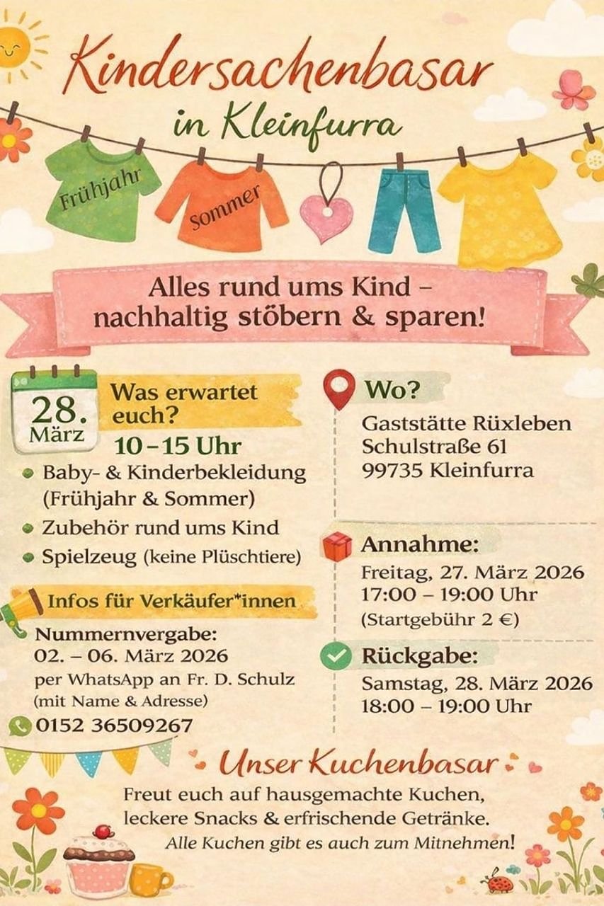 Demnächst findet wieder der beliebte Kindersachenbasar in Kleinfurra statt. Angeboten werden gut erhaltene Baby- und Kinderbekleidung für Frühjahr und Sommer, Zubehör rund ums Kind sowie Spielzeug... Besucherinnen und Besucher haben die Möglichkeit, nachhaltig einzukaufen, schöne Schnäppchen zu entdecken und gleichzeitig die Umwelt zu schonen.