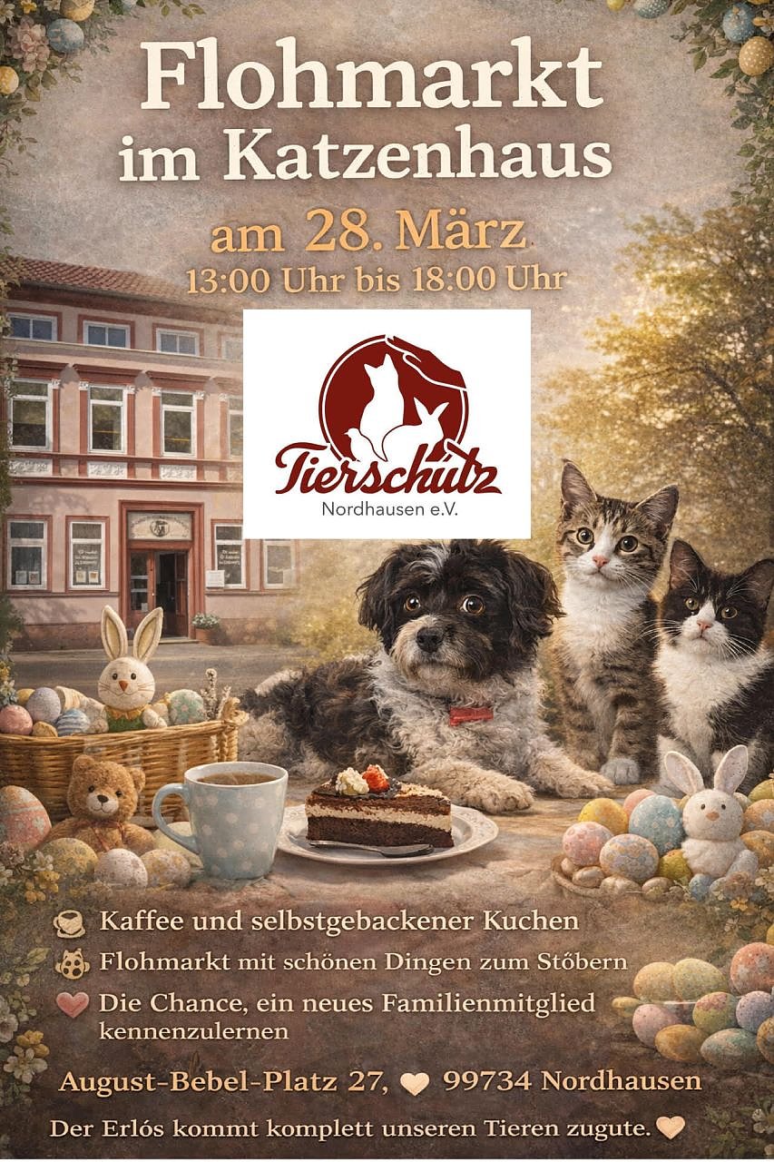 Der Tierschutz-Verein Nordhausen lädt am 28. März zu einem kleinen Flohmarkt in sein Katzenhaus, August-Bebel-Platz 27, ein. Die Veranstaltung steht ganz im Zeichen des Tierschutzes...Sämtliche Einnahmen kommen direkt den betreuten Tieren zugute. In der Zeit von 13 bis 18 Uhr haben Besucherinnen und Besucher die Gelegenheit, nach Second-Hand-Schätzen zu stöbern. Ergänzt wird das Angebot durch Kaffee und selbstgebackenen Kuchen, die zum Verweilen einladen.