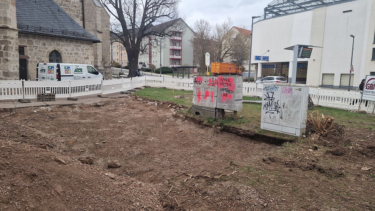 Per Kran wurde heute morgen die Technikkammer für die neuen Brunnenanlagen in das Erdreich hinabgelassen. Keine Arbeit, die man alle Tage erledigt, erzählt Mario Manolow vom Amt für Stadtentwicklung. Allein den Kran über den Platz an die richtige Stelle zu manövrieren sei kein leichtes Unterfangen gewesen. Kurz nach acht Uhr ist aber klar: Es ist alles gut gegangen. Die 27 Tonnen schwere Kammer ist versenkt und abgedeckt. Trotz des schweren Geräts und wenig Platz haben die Bäume vor der Kirche keinen Schaden davon getragen.
