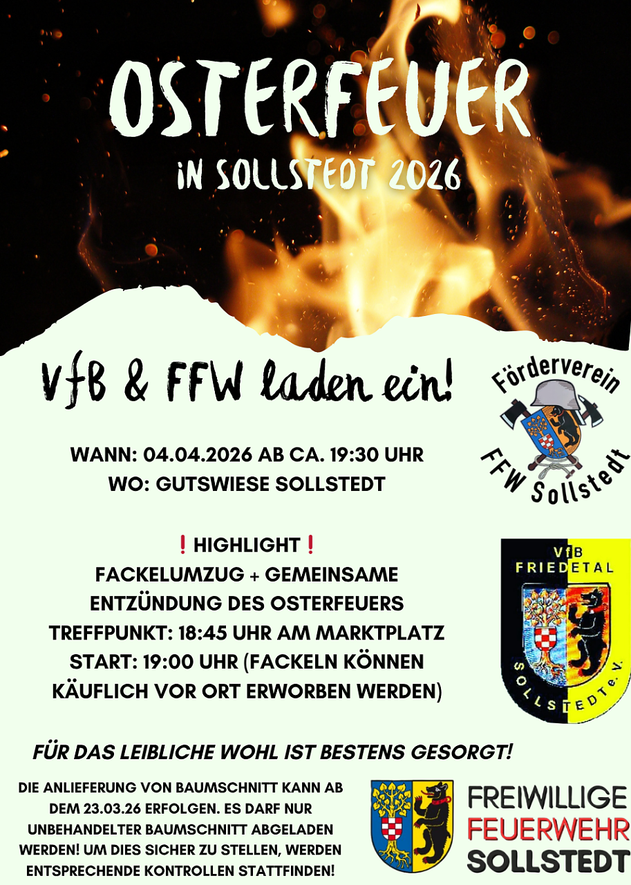 Auch in diesem Jahr laden der VfB Friedetal Sollstedt und die Freiwillige Feuerwehr Sollstedt zum traditionellen Osterfeuer ein...Die Veranstaltung findet Ostersamstag auf der Gutswiese statt, wo das Feuer gegen 19.30 Uhr entzündet wird. Bereits um 19 Uhr startet am Marktplatz ein stimmungsvoller Fackelumzug, der direkt zum Osterfeuer führt und dort seinen Höhepunkt findet.