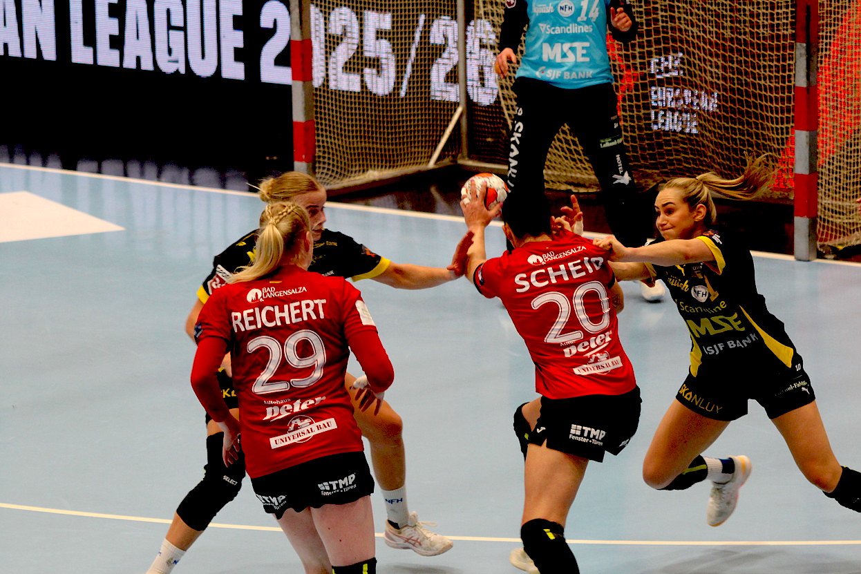 Autor: redIn einer nervösen Anfangsphase gerieten die Gastgeberinnen schnell in Rückstand und konnten sich nur dank einer überragenden Johanna Reichert im Spiel halten. Nach dem Zweitorerückstand nach elf Minuten war der Vorsprung aus dem Hinspiel nach einem Viertel der Spielzeit bereits aufgebraucht und es stand 9:13 nach 15 Minuten. Gefühlt war zu diesem Zeitpunkt jeder Wurf der Däninnen ein Treffer, während die Thüringerinnen einige Abschlussproblem offenbarten und im Abwehrverbund keinen sicheren Eindruck hinterließen. Folgerichtig erhöhten die Gäste weiter und führen zwischenzeitlich mit sechs Toren Vorsprung. Doch die Müller-Mädels steckten nie auf und spätestens als Laura Kuske in der 28. Minute einen Siebenmeter der bis dahin treffsicheren Clara Lerby parieren konnte, war die Rote Wand da und unterstützte ihr Team frenetisch. Mit 18:22 ging es in die Kabinen und vieles sprach zu diesem Zeitpunkt für die Damen aus dem nordischen Nachbarland.
