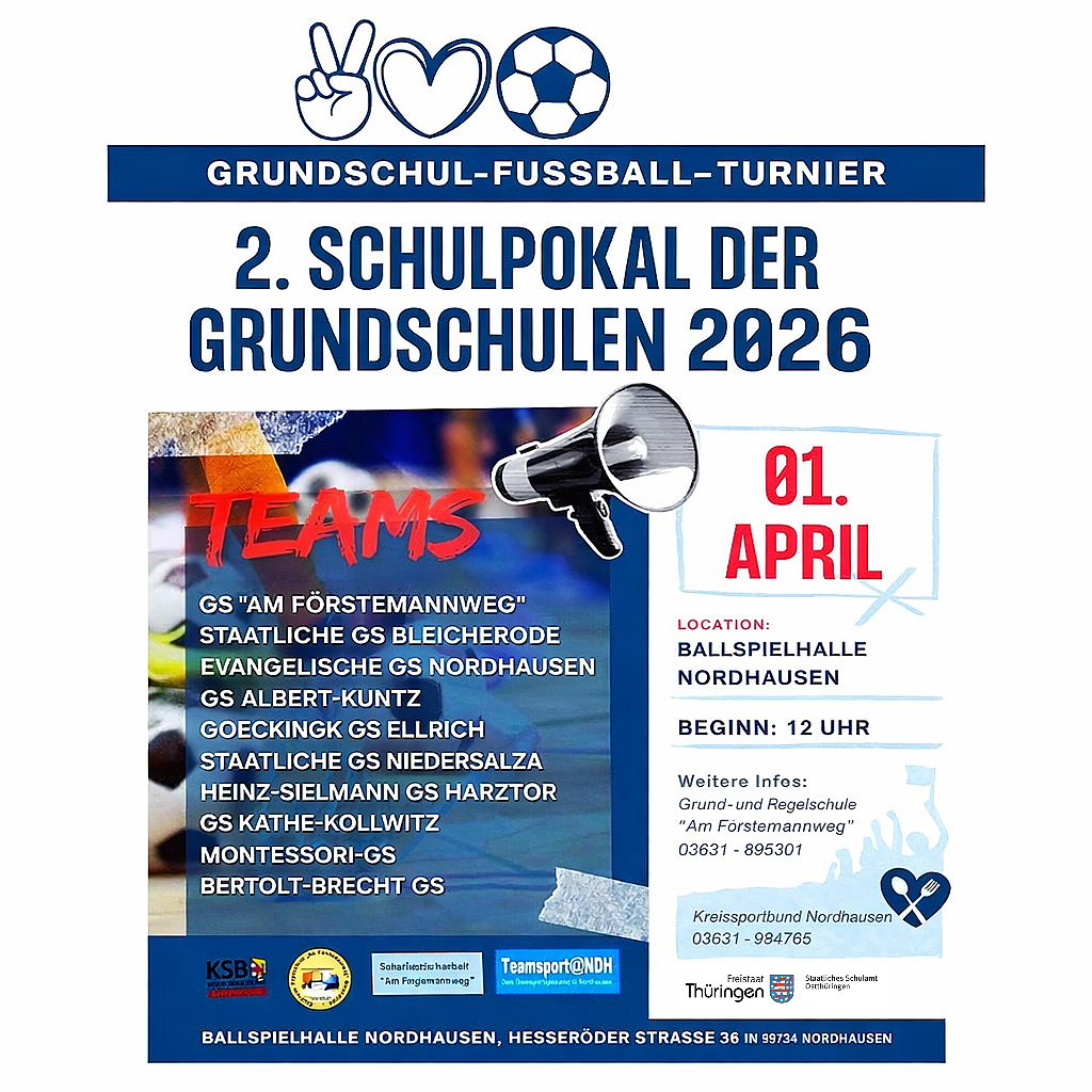 Zehn Grundschulen aus dem Landkreis kämpfen in der Ballspielhalle um den begehrten Schulpokal. Zuschauer können die Teams von den Rängen aus anfeuern...Am Mittwoch wird die Ballspielhalle zum Schauplatz spannender Fußball-Duelle: Zehn Grundschulen aus dem Landkreis treten beim Hallenfußballturnier gegeneinander an und kämpfen um den Schulpokal. Ausrichter der Veranstaltung sind die Grund- und Regelschule Am Förstemannweg sowie das Staatliche Schulamt Nordthüringen. Tatkräftige Unterstützung erhalten sie vom Kreissportbund Nordhausen, der Schulsozialarbeit Am Förstemannweg und Teamsport Nordhausen.