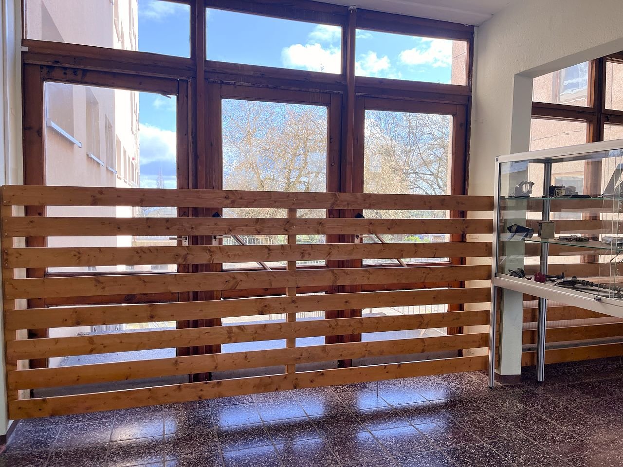 Allerdings hat dieser Charme längst seine Schattenseiten. Im Winter wird das ungedämmte Haus nicht richtig warm. Die Holzfenster und Türen im Mitteltrakt sind vernagelt und zusätzlich mit mannshohen Holzgittern gesichert. Viele Fenster lassen sich daher nicht öffnen. Gerade im Sommer haben wir in manchen Räumen schon am Vormittag Temperaturen von über 30 Grad. Das ist kein Zustand, sagte Schulleiter Martin Drick im jüngsten Schulausschuss des Landkreises. Die Mitglieder hatten sich vor Ort ein Bild gemacht.