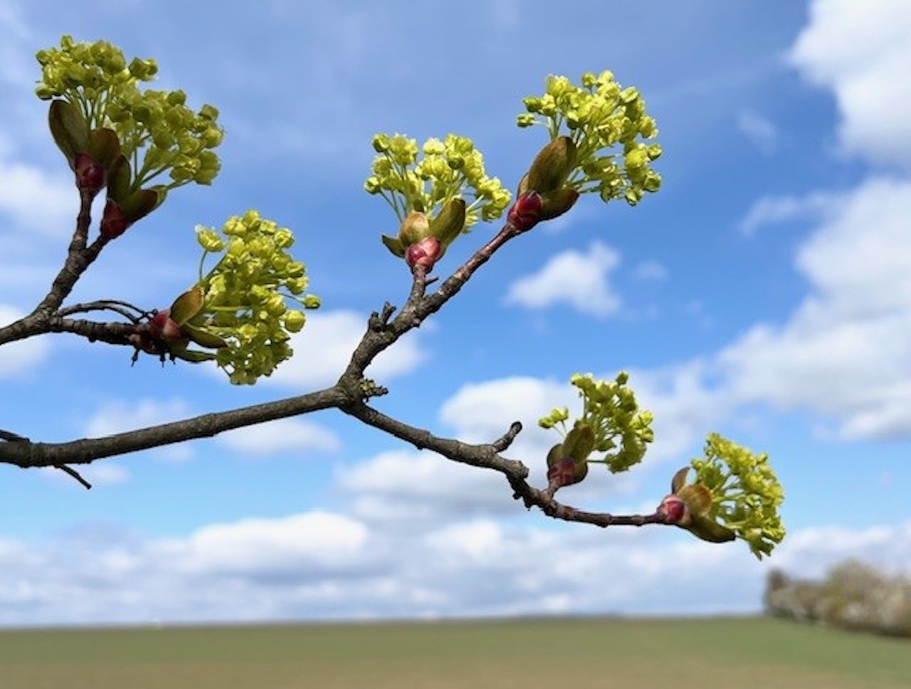 Das zweite Foto ist ein blühender Ahorn, aufgenommen in der Sundhäuser Flur in der Nähe von Steinbrücken. Leider werden dort im Moment wichtige Rückzugsorte der Rehe durch den Aufbau von Photovoltaik-Feldern zerstört.
