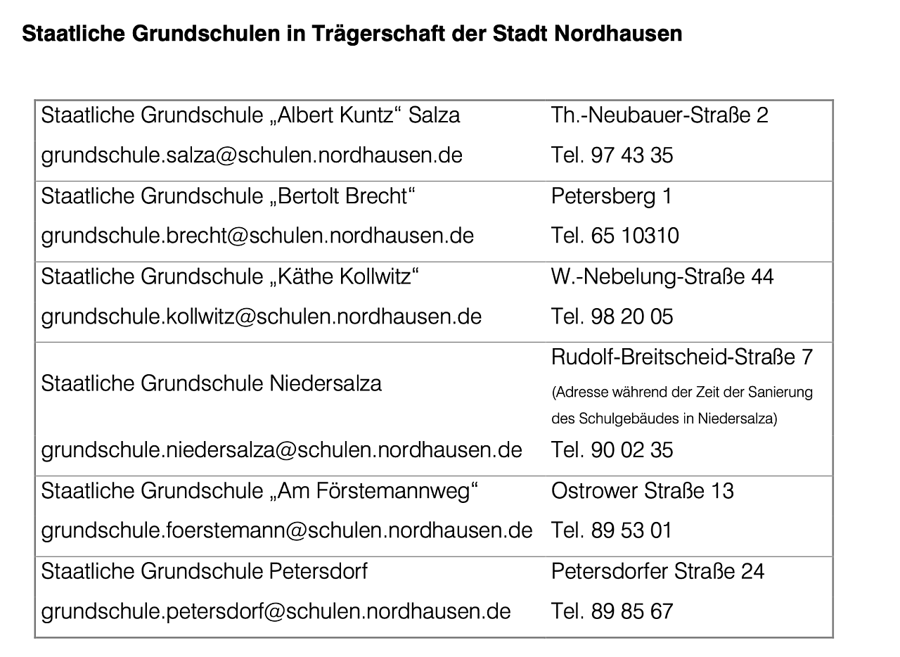 Weitere Informationen rund um die Einschulung in einer der unten genannten Staatlichen Grundschule, z.B. Schülerbeförderung, Möglichkeit der freien Schulwahl, Hortbetreuung usw. erhalten Sie in den Schulen direkt, auf der Internetseite der Stadt Nordhausen www.nordhausen.de/Leben/Schulen, auf der Internetseite des Thüringer Ministeriums für Bildung, Wissenschaft und Kultur, oder in der Stadtverwaltung unter 03631 – 696 9491.