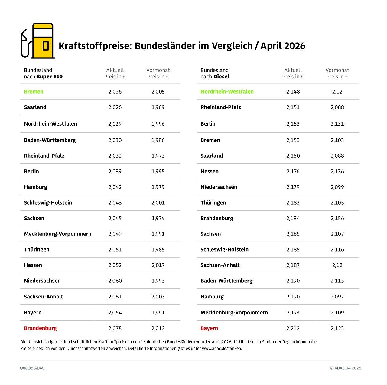 Für die heutige Untersuchung hat der ADAC die Preisdaten von mehr als 14.000 bei der Markttransparenzstelle für Kraftstoffe erfassten Tankstellen ausgewertet und den 16 Bundesländern zugeordnet. Die ermittelten Preise stellen eine Momentaufnahme vom 16. April 2026 (11 Uhr) dar.