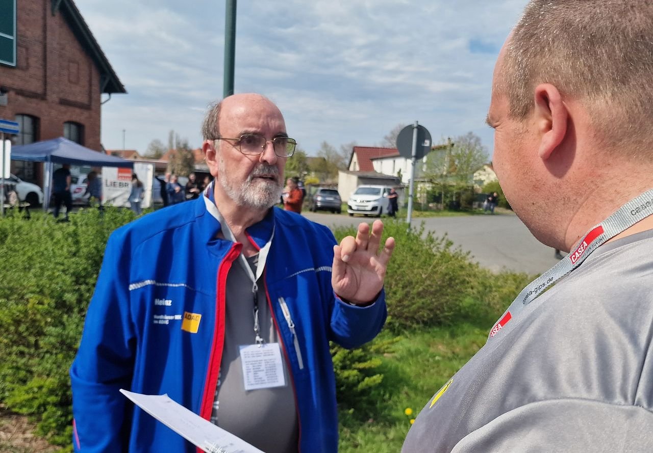 Das älteste Gefährt auf der Strecke ist ein 40 Jahre alter Trabant, geführt vom Bleicheröder Wolfgang Streutel. Fast genauso lange ist Sievert beim Nordhäuser MSC und der Roland-Rallye dabei. Der 75jährige hätte sich gewünscht, noch einmal ein Rennen im Gehege organisieren zu können, in Anbetracht des Baufortschritts an der Wallrothstraße wird daraus aber wohl nichts mehr, meint Sievert. Bauarbeiten haben auch heute zu ein paar Änderungen geführt, durch die Arbeiten an der B243 wurde eine Wertungsprüfung nach Bielen verlegt, über Feld- und Schotterwege geht es von hier in Richtung Leimbach und in die Windlücke, ehe man nahe der Ziegelei das Ziel erreicht.