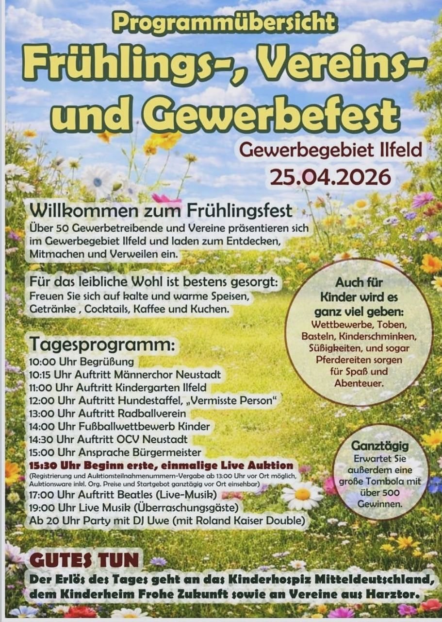 Mit einem abwechslungsreichen Programm und zahlreichen Mitmachangeboten lädt das Autohaus Gerecke am kommenden Samstag, 25. April, zum großen Frühlings-, Vereins- und Gewerbefest nach Ilfeld ein. Mehr als 50 Gewerbetreibende und Vereine präsentieren sich vor Ort und bieten Besucherinnen und Besuchern die Möglichkeit, regionale Angebote zu entdecken und ins Gespräch zu kommen.