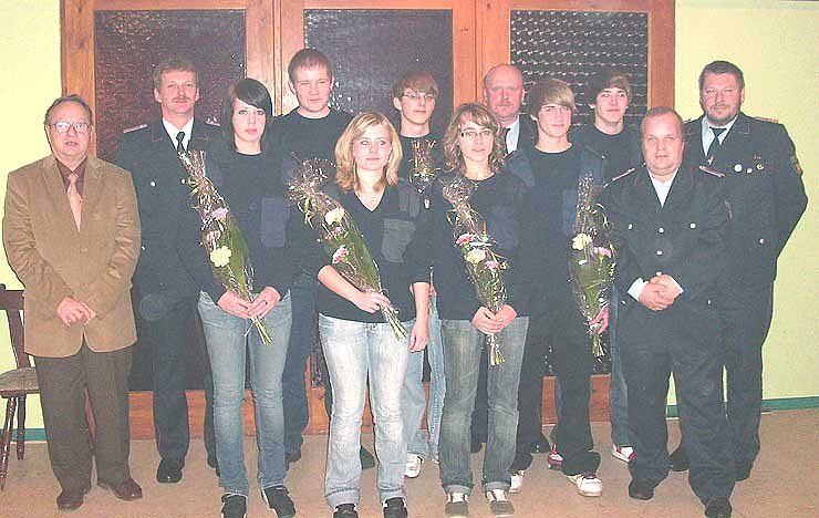 Hintere Reihe: Bürgermeister Siegfried Junker, Jugendwart Rene Krafcick, Alexander Blanke, Denis Hauswald, Stellv. Ortsbrandmeister Ingbert Kupfer, Steffen Junker, Ortsbrandmeister Bernd Hoffmann