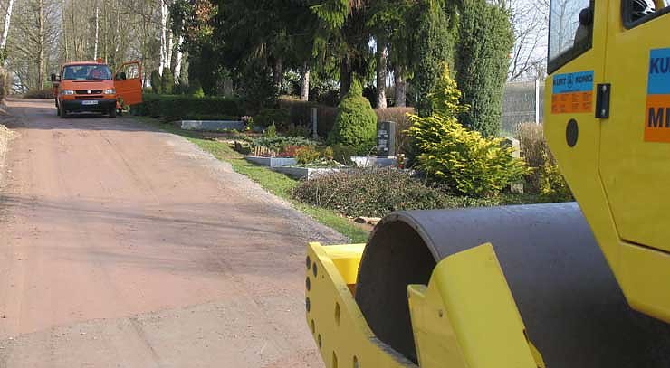 Die letzten Arbeiten auf dem Weg im östlichen Teil des Hauptfriedhofes nahe der Gartenanlage Am Roßmannsbach haben heute die Mitarbeiter des städtischen Bauhofes erledigt. Sie befestigten mit einer Walze den Weg und brachten danach eine wassergeschlämmten Decke aus Steinmehl auf. Aus dem unbefestigten Hauptweg wurde vorher altes Erdreich ausgehoben und wieder mit Splitt aufgefüllt. Außerdem wurden vier Sickerschächte zum Ablaufen für das Oberflächenwasser eingebaut.