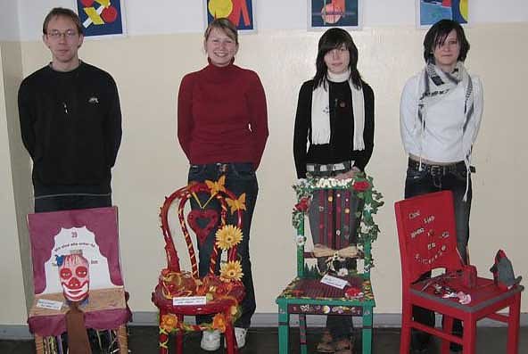 Die Schüler des Bleicheröder Kunstkurses 12 II bei Frau A. Ball haben einen Stuhl ihrer Wahl als Abschlussarbeit gestaltet und dabei sehr individuelle Lösungen gefunden. Die Arbeiten sind in der 3. Etage des Schillergymnasiums ausgestellt.