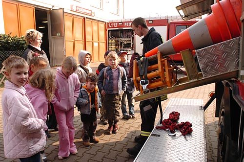 34 Mädchen und Jungen wollten den Feuerwehrmännern über die Schultern schauen. Sie konnten sogar dabei sein, als Metallrohre mit Schere und Spreizer zerlegt wurden. Probesitzen im Mannschaftswagen war natürlich auch möglich. Jedes Kind durfte sie wie ein Feuerwehrmann fühlen. Vielleicht findet auch der eine oder andere den Weg zur Jugendfeuerwehr. Gäste sind der Freiwilligen Feuerwehr immer willkommen.