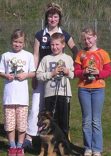Bei dieser Prüfung wurde auch um den Wanderpokal des Vereins gekämpft. Den Gesamtsieg errang wie bereits im Vorjahr Monika Klement mit ihrer Kiss vom Eis. Auch 3 Kinder nahmen als jüngste Teilnehmer an der Prüfung teil. Sie legten ihren Sachkundenachweis zur Hundeführerlizenz ab, darauf haben sich die Jüngsten umfassend vorbereitet und sind jetzt auf viele Situationen in der Hundeausbildung gewappnet. Maximilian Krause (9 Jahre), Sahra Klement (10 Jahre) und Theresa Greiner (11 Jahre) bestanden diese Prüfung ohne Fehler. Jetzt ist auch für die Jüngsten die 1. Hürde zur praktischen Ausbildung mit ihren vierbeinigen Freunden geschafft.