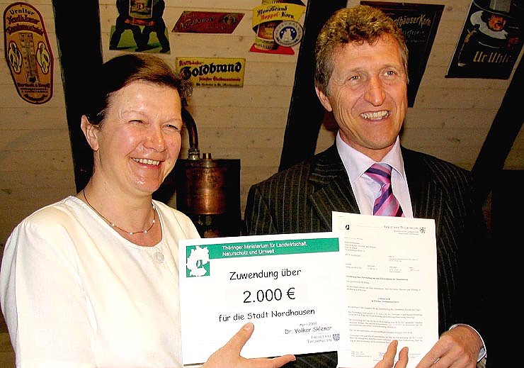 Einen Zuwendungsbescheid über 2.000 Euro zur finanziellen Unterstützung der Nordhäuser KornKulturTage übergab heute der Thüringer Minister für Soziales, Familie und Gesundheit, Dr. Klaus Zeh (CDU), an Kulturamtsleiterin Dr. Cornelia Klose. Ich bin heute nur der Überbringer, sagte er. Die Mittel seien vom Thüringer Ministerium für Landwirtschaft, Natur und Umwelt gern gewährt worden, da die Region Nordhausen besonders durch die lange Tradition der Nordhäuser Kornbrennerei deutschlandweit bekannt gemacht wurde, so Dr. Zeh.