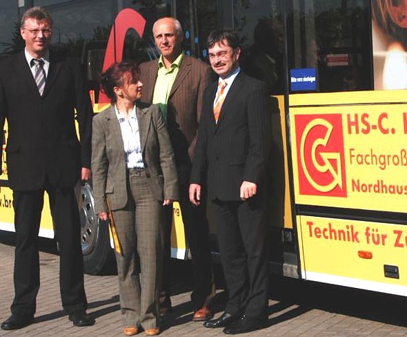 Als Werbepartner konnte das Unternehmen HS-C. Hempelmann KG gewonnen werden, das auf den Vertrieb von Haustechnik spezialisiert ist. Der neu gestaltete Bus konnte durch den Niederlassungsleiter Nordhausen, Norbert Stöter, und die Geschäftsführer der Verkehrsbetriebe, Mathias Hartung und Gabriele Schuchardt, eingeweiht werden (v. l. n. r. Norbert Stöter, Gabriele Schuchardt, Detlef Hundt, Mathias Hartung).