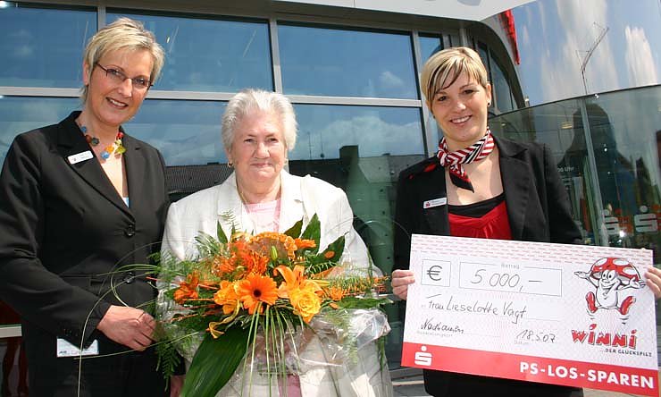 Autor: nnzFrau Voigt gewann 5.000 Euro in der Mai-Auslosung. Völlig überrascht war Lieselotte Voigt als sie den gehaltvollen Scheck zusammen mit einem frühlingshaften Blumenstrauß von Sandra Steinecke in Empfang nahm. Damit hatte die PS-Los-Sparerin nicht gerechnet.