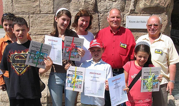 Heute war es für Kevin Struck (10 Jahre), Henriette Schwinn (12 Jahre), Konstantin Meier (12 Jahre) und Josefine Müller (11 Jahre) endlich so weit (im Bild von links nach rechts). Nach 3-monatiger Anleitung und Ausbildung durch Winfried Wehrhahn und Klaus Großmann von der Stadt- und Gästeführergilde erhielten sie aus den Händen von Kulturamtsleiterin Dr. Cornelia Klose ihr Zertifikat zum Nordhäuser Kinderstadtführer und als Geschenk ein Buch über die Geschichte Nordhausens.