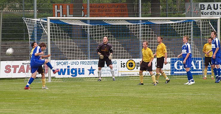 Aber Honnef konnte nicht verhindern, dass die Nordhäuser ihr letztes Heimspiel in dieser Saison mit 2:0 gewannen. Das 1:0 fiel in der 13. Minute, nach dem Wacker quasi im Powerplay das Sonneberger Tor berannte. Lars Pohl flankte von rechts in den Strafraum und Stefan Hoffmann war mit dem Kopf zur Stelle. Doch danach verflachte das Spiel, es dauerte bis zur 31. Minute, bis das Leder zum zweiten Mal im Sonneberger Tor versenkt wurde. Diesmal war Sebastian Gösel mit dem Kopf da.