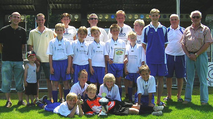 Auf dem Foto sehen wir außer den stolzen Siegern und ihren Übungsleitern auch die fleißigen Mitarbeiter der MS Eura, die ebenso wie die Wacker-Verantwortlichen zum guten Gelingen des Turniers beigetragen haben.