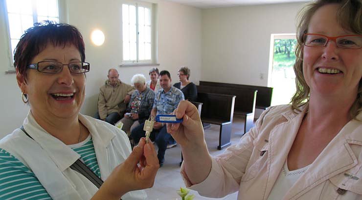 Jetzt herrschen angemessene Verhältnisse, wie sie für eine Trauerfeier würdig sind, sagte Nordhausens Bau- und Wirtschaftsdezernentin Inge Klaan (rechts) heute Nachmittag bei der Übergabe der sanierten Trauerhall im Ortsteil Herreden an die Ortsbürgermeisterin Sabine Jacobi (links) und Mitglieder des Ortschaftsrates.