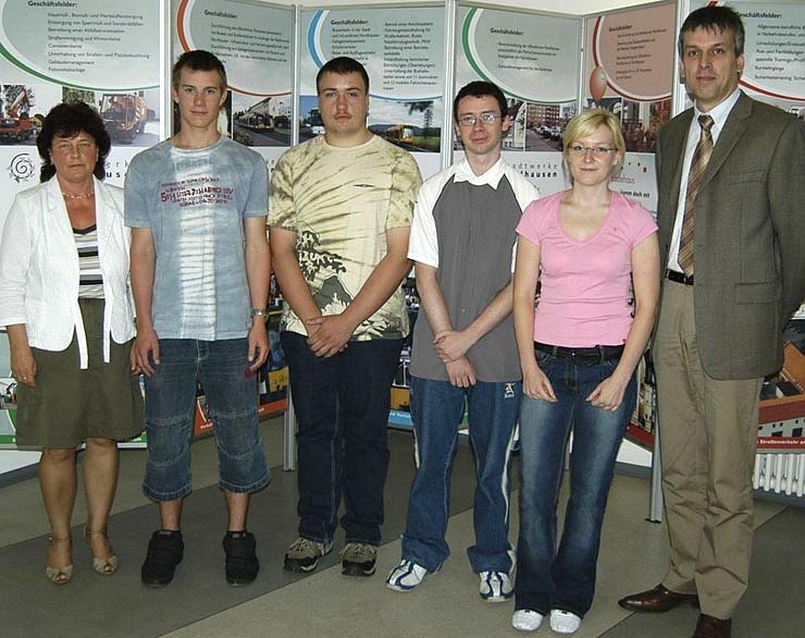 In der letzten Augustwoche begannen fünf neue Auszubildende ihre Lehrzeit. Sie werden als Kraftfahrzeugmechatroniker, Fachkraft im Fahrbetrieb, Fachkraft für Kreislauf- und Abfallwirtschaft, Fachangestellter für Bäderbetriebe und als Bürokauffrau ausgebildet. Spitzenreiter in der Lehrlingsausbildung der Stadtwerke-Unternehmen ist die Stadtwirtschaft GmbH, in der 4 junge Männer in den Lehrjahren 1 bis 3 den Abschluss als Fachkraft für Kreislauf- und Abfallwirtschaft anstreben.