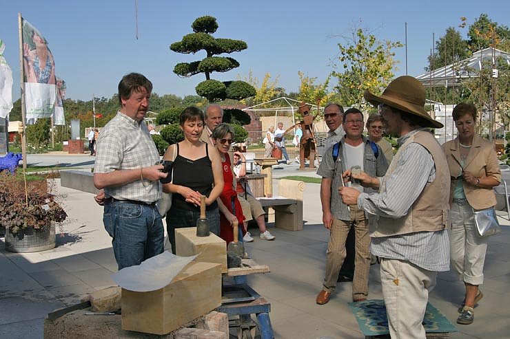 Der 42jährige Steinmetz hatte sich schon als Jugendlicher keinen anderen Beruf als den des Steinmetzes vorstellen können. Es ist diese Dauerhaftigkeit, die ich an den Natursteinen mag, ich kann sie formen, bearbeiten, neue Dinge aus ihnen herstellen und doch bleiben sie beständig, überdauern Wind und Wetter, schwärmt Fehling. Und es geht auch um Tradition: deshalb ist er besonders stolz, dass er bereits fünf Auszubildenden das harte Handwerk beibringen konnte. Insofern war der BUGA-Besuch auch ein Stück Werbung – für sein Hofatelier in Herreden und seinen traditionellen Beruf.