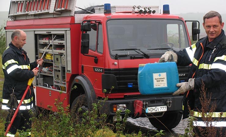 Wilfried Bühling und Rainer Bärschneider von der Berufsfeuerwehr bergen die vermeintlich vollen Öl-Tanks. (I. Bergmann)