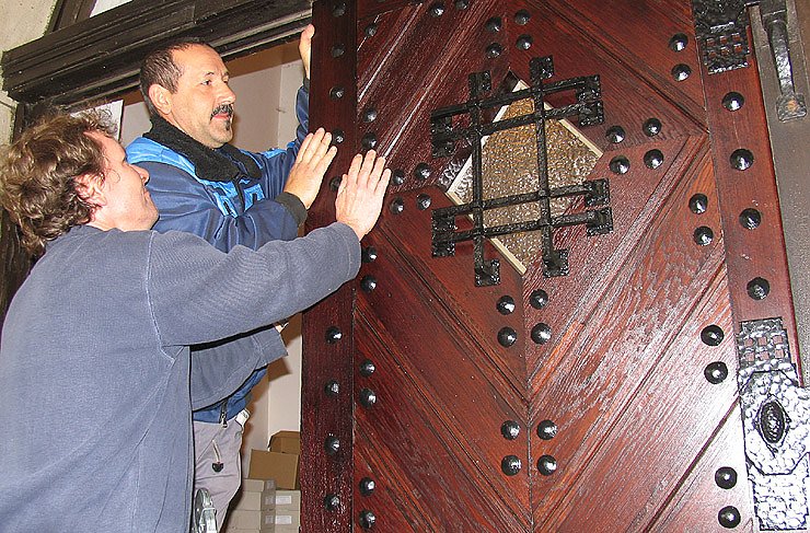 Hein-Peter Schmidt und Fred Busch vom städtischen Bauhof beim Einsetzen der Tür.(I. Bergmann)