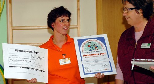 Die AOK spendete dem integrativen Kindergarten 200 Euro, von denen Sportgeräte angeschafft werden sollen. Loni Grünwald brachte einen Satz T-Shirts für sportliche Aktivitäten. Ein Türschild und eine Urkunde erinnern die Kindergartenkinder immer daran, daß sie besonders sportlich sind und weiter aktiv bleiben wollen. Rund 20 Prozent der Kinder nehmen den Trainingseifer auch nach hause mit. Sie besuchen in ihrer Freizeit schon jetzt einen Sportverein.