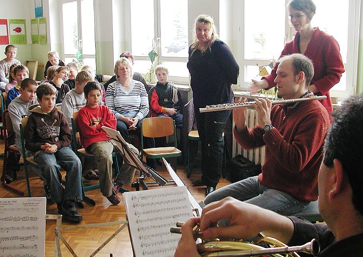 Aufführungsort war allerdings nicht eine Konzerthalle oder das Theater, sondern ein ganz normales Klassenzimmer. Und dort, wo gewöhnlich etwa 50 Musiker sich mit Peter und der Wolf befassen, war gerade mal Platz für fünf. Und dass das musikalische Märchen in dieser kleinen Formation auch bestens erzählt werden kann, davon konnten sich die Kinder überzeugen. Sie folgten aufmerksam der watschelnden Ente, die durch die Oboe dargestellt wurde, dem Tirili des Vogels auf der Querflöte, dem schwerfälligen Bass des Großvaters im Fagott oder der schleichenden Katze, die durch die Klarinette vertont wurde. Und dann war da noch das Horn - der Wolf. Zusammen spielte das Quintett die Jäger.