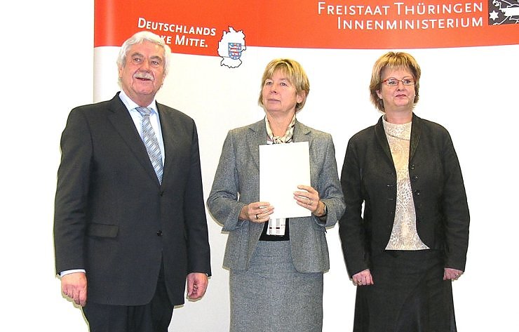 Zur Geschenkübergabe reiste heute die Nordhäuser Oberbürgermeisterin Barbara Rinke nach Erfurt ins Innenministerium. Thüringens Innenminister Karl Heinz Gasser hatte alle Bürgermeister jener Orte eingeladen, die seit Monatsanfang per Gesetz umliegende Orte eingemeindet hatten. Darunter auch Nordhausen und Bleicherode.