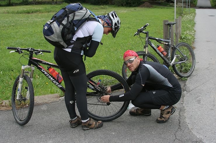 Trotzdem beschlossen wir, eine alternative Route über Bormio zu nehmen. Wir hofften so, aus einem »Zweibergtag« einen »Einbergtag« zu machen. Also erstmal bergab nach Bormio. Kurz vor Bormio fanden wir einen Fahrradladen, um Anastazias Bremse checken zu lassen. Der freundliche Mechaniker säuberte erst mal das saudreckige Fahrrad mit einem Hochdruckreiniger um dann festzustellen, dass es wohl die Bremsbeläge wären, er aber keinen entsprechenden Ersatz da hätte. Das alles in englisch mit etwas italienisch. Also weiter.