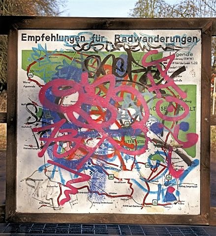 Zu den Schmierereien von vor zwei Jahren sind weitere hinzugekommen. Vermutlich sollen die einstige Empfehlungen für Radwanderungen als Projekt einer "alternativen Jugendkunstschule" herhalten.
