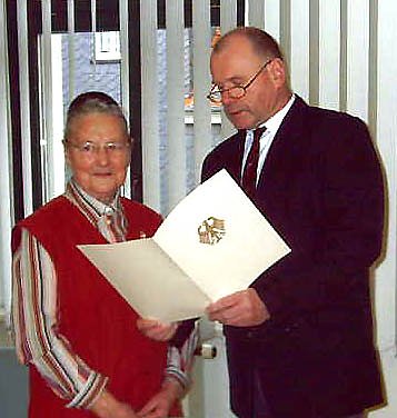 Bundespräsident Horst Köhler hat der Wernaerin als Dank für ihr 41jähriges ehrenamtliches Engagement nun die Verdienstmedaille des Verdienstordens der Bundesrepublik Deutschland verliehen. Die Auszeichnung wurde Gudrun Model gestern in Ellrich von Roland Baer - Leiter der Regionalen Messnetzgruppe des DWD in Leipzig - im Rathaus der Stadt Ellrich feierlich überreicht. Baer überbrachte Gudrun Model den Dank des Bundespräsidenten und würdigte die außerordentliche Zuverlässigkeit und Einsatzbereitschaft der Geehrten.