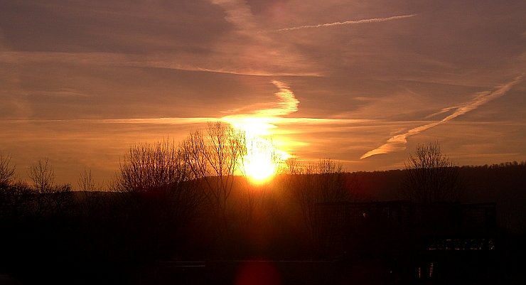 Diese Bild dokumentiert den Sonnenuntergang über der Eichsfelder Pforte aus Richtung Gebra, aufgenommen auf der B 80 am 1. Februar 2007
