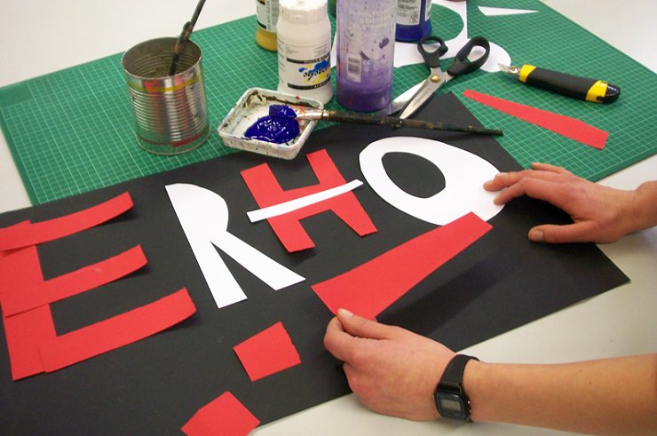Autor: nnzDer Workshop setzt sich aus theoretischen Abhandlungen und praktischen Anwendungen zusammen. Die Teilnehmer lernen verschiedene Schrifttechniken und -arten kennen. Buchstaben können gerissen, geschnitten, gemalt und auch konstruiert werden. Im Ergebnis stehen dann unkonventionelle Schriftgrafiken.