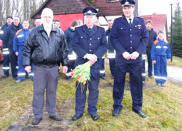 Zur Verabschiedung von Lutze war auch Ortsbürgermeister Tilo Große (vorn links) gekommen, der Lutzes Engagement wie auch das der Feuerwehr insgesamt für Petersdorf und seine Bürger lobte. Besonders angenehm war, dass die Kameraden nie übertriebene Forderungen gestellt haben, aber immer zur Stelle waren, wenn sie gebraucht wurden, sagte Große.