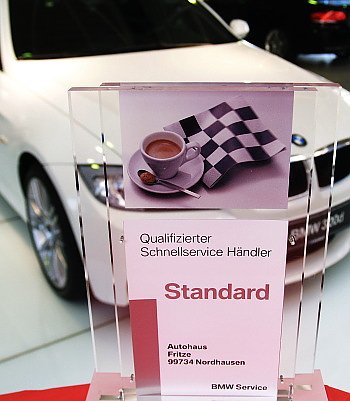 Zufriedene Kunden sind der Lohn eines jeden Unternehmens. Dennoch freuen sich Firmenchefs auch über andere Anerkennungen. Steffi Fritze gehört seit dem heutigen Nachmittag dazu...Für den so genannten BMW Schnellservice ist das Nordhäuser BMW-Autohaus Fritze heute durch die Münchner Zentrale des Autobauers ausgezeichnet worden. Schnellservice bedeutet: Kurzfristig einen Termin bekommen, pünktlich bedient werden, eine Stunde später das Auto abholen und das alles zu einem Festpreis.