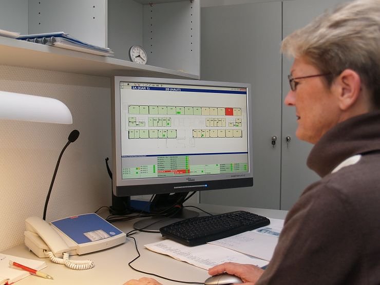 Autor: nnzSchwester Doris an ihrem Arbeitsplatz im ComCenter. Hier sind zwei Arbeitsplätze vorhanden. Ein Arbeitsplatz kann bei Bedarf zu Ausbildungszwecken genutzt werden. Modernste Technik ermöglicht eine effiziente Kommunikation zwischen Patient, Schwester Inge und dem medizinischen Personal auf der jeweiligen Station.