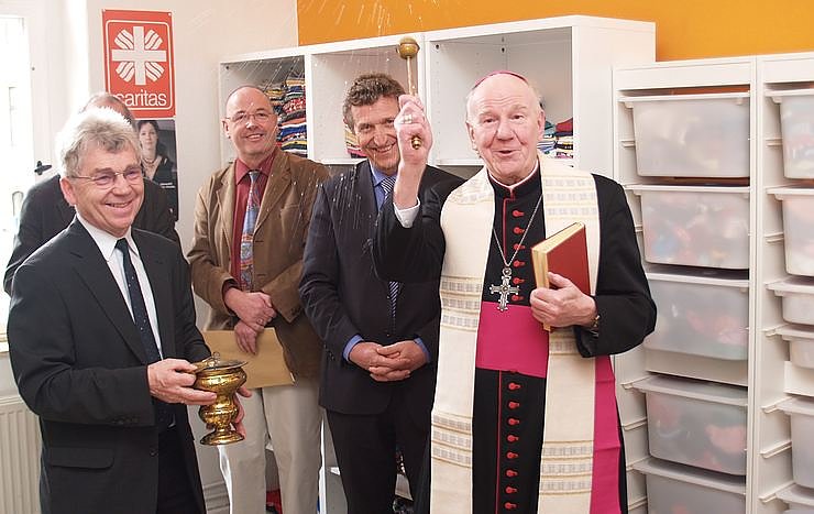 Der Nordhäuser Caritas-Chef lobte vor allem das Engagement der vielen fleißigen Leute, die bis zur letzten Stunde vor der heutigen Eröffnung die erste Etage in der Landgrabenstraße u einem Schmuckstück umgebaut hatten. Unter den Gästen auch Weihbischof Koch, der gerne seine Dienstbekleidung gegen ein T-Shirt eingetauscht hätte, nur: Die hier vorhandenen Schuhe waren zu klein. Im Anschluß an die Reden wurden die hellen, freundlichen Räume der Tauschbörse geweiht.