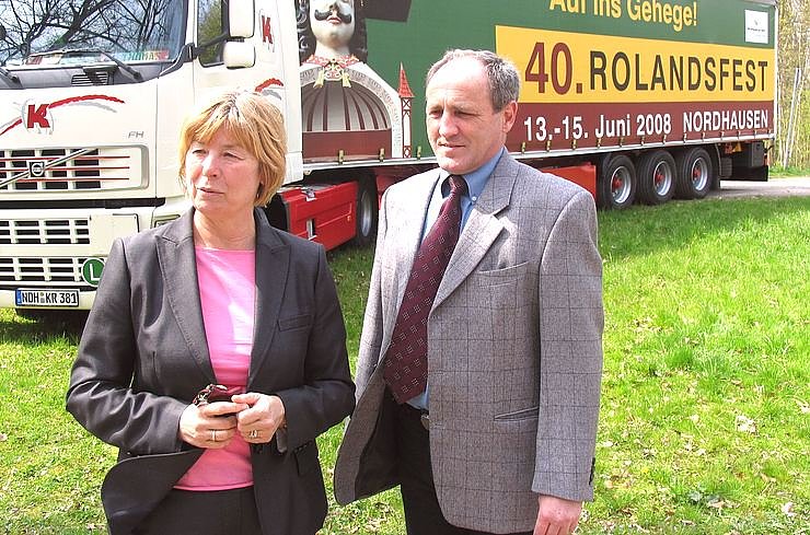 Ralph Böttcher, der Leiter der Nordhäuser Speditions-Niederlassung (rechts), sagte, man setze damit die jahrelange Marketing-Partnerschaft mit der Stadt Nordhausen fort. Nach der Werbung für die Landesgartenschau 2004 sowie für zurückliegende Rolandsfestes und Stadtjubiläen betrachte man es als Selbstverständlichkeit, auch für das 40. Rolandsfest zu werben. Denn wir fühlen uns mit Nordhausen enge verbunden – und das wollen wir zeigen, so Böttcher.