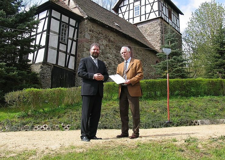 5000 Euro aus Lottomitteln für die Sanierung der Kirche St. Philippi und Jacobi in Nordhausens Ortsteil Rodishain hat jetzt Thüringens Wirtschaftsminister Jürgen Reinholz (rechts) an den Gemeindepfarrer Jörg Thoms (links) übergeben. Mit dem Geld sollen Dachklempnerarbeiten, die Erneuerung des Blitzschutzes sowie Malerarbeiten an der Giebelwand erledigt werden. An der Geldübergabe hatten Ortsbürgermeister Herbert Becker sowie Nordhausens Bürgermeister Matthais Jendricke teilgenommen. Die Rodishainer Kirchgemeine hat 147 Mitglieder und gehört zum Kirchenkreis Eisleben.