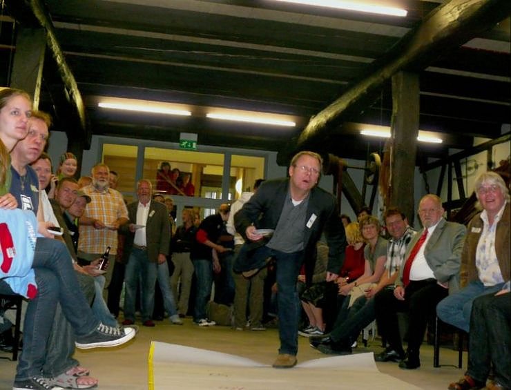 Der städtische Pressesprecher Patrick Grabe (4. Platz) beim Priem-Weitspucken im Tabaksspeicher