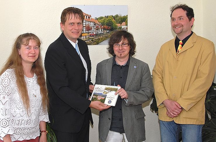 Buchübergabe durch Dirk Schröter an Matthias Ehrholdt im Beisein der beiden Autoren Martina Zimmer und Andreas Friese. Die Stadt Ellrich hat dieses Projekt finanziell unterstützt