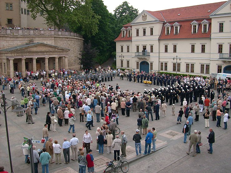 Autor: khhIn einem Sternmarsch zogen drei Militärkapellen durch die Stadt zum Marktplatz. Den kürzesten Weg hatte das Wehrbereichsmusikkorps III Erfurt, unter der Leitung von Oberstleutnant Kahle. Es zog von der Galerie am Schlosspark durch die Carl-Schroeder-Straße zum Markt. Die jenigen, die den weitesten Anfahrweg hatten, mussten auch am weitesten laufen. Das Marinemusikkorps Ostsee Kiel unter Leitung von Fregattenkapitän Peter musste von der Galerie durch die Hauptstraße und dann erst durch die Burgstraße zum Markt. Es besser hatte es das Luftwaffenmusikkorps 4 Berlin, unter Leitung von Hauptmann Prchal. Sie mussten nur vom Planplatz durch die Wezel-Straße und Burgstraße zum Markt.
