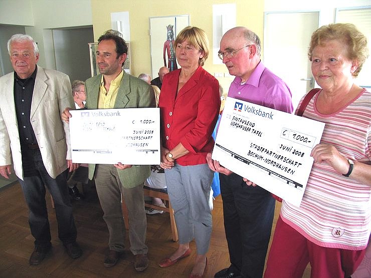 Einen Scheck über jeweils 1000 Euro übergab jetzt der Bochumer Vereinsvorsitzende Paul Schrader (2.v.r.) an Helga Rathnau von der Nordhäuser Tafel und Harald Ströbele, den stellvertretenden Leiter des Pestalozzi-Förderzentrums. Ich bin sprachlos ob der Höhe der Spende – und habe es gleich umgerechnet in Schüler-Essensportionen: Es sind mehr als 600. Vielen Dank, sagte Ströbele.
