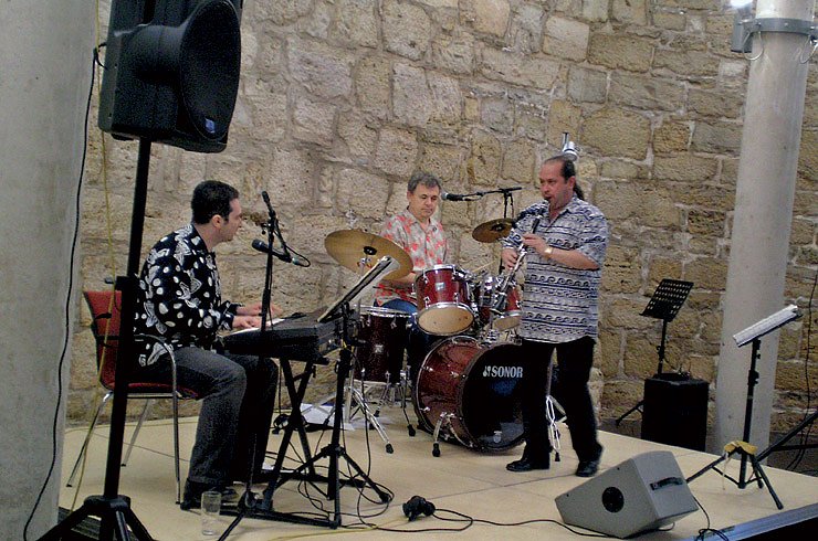 Die Klezmer-Gruppe OKNA aus Dresden: Sergey Trembitskiy (Keyboard, Musikhochschule Dresden), Toni Daskalow (Schlagzeug, Bulgarien) und Gennadiy Nepomnyashchiy (Klarinette, Ukraine).