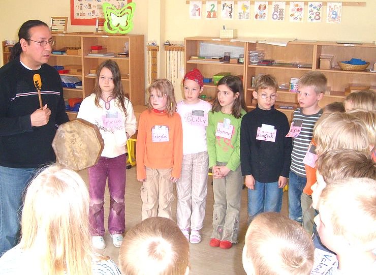 Die Schüler der Montessori-Grundschule sind sehr begeistert über das Angebot, welches Wayne Vandell, ein Dakota Indianer für sie anbietet. Als Bildungsreferent und Angestellter des Jugendsozialwerk Nordhausen erzählt er den Kindern von seinem Heimatland. Mit großer Begeisterung und offenem Mund lauschen sie gespannt, wenn er über die Geschichte der Indianer berichtet.