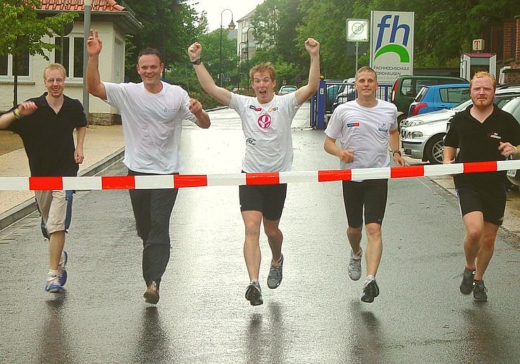 Autor: nnzRektor Jörg Wagner (2.v.l.) und der Marathonmann Ben Steinhäuser (Mitte) beim Zieleinlauf auf dem Campus